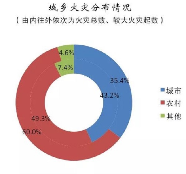 從城鄉(xiāng)火災(zāi)的分布看,全年農(nóng)村地區(qū)共發(fā)生火災(zāi)12.4萬起,占總起數(shù)的49.3%,比城鎮(zhèn)高出6.1個(gè)百分點(diǎn),造成損失19.2億元,占總損失的48.1%,比城鎮(zhèn)高出12.2個(gè)百分點(diǎn),火災(zāi)基數(shù)仍然較大;特別是農(nóng)村地區(qū)共發(fā)生較大火災(zāi)39起,占總數(shù)的60%,比城鎮(zhèn)高出近七成。